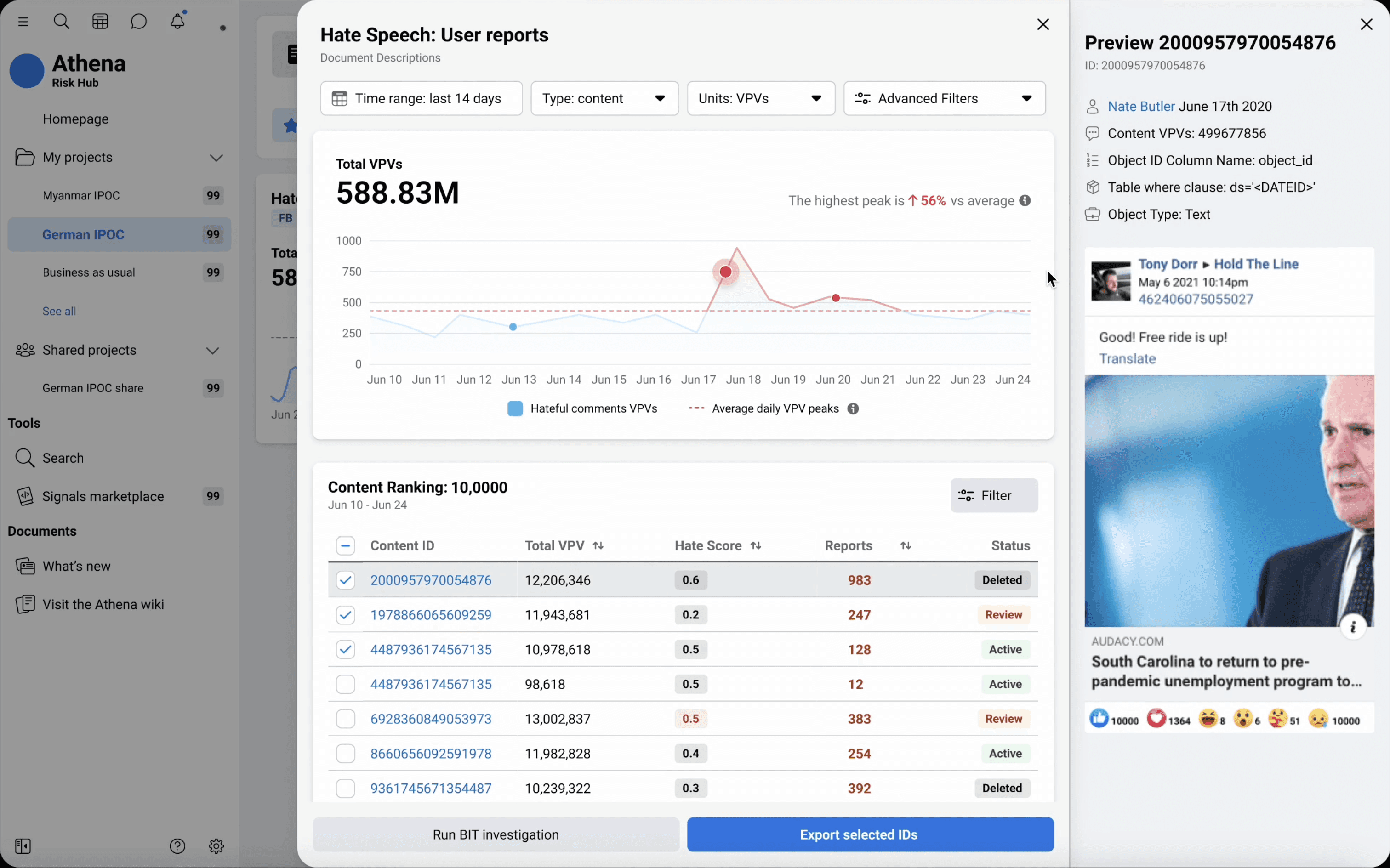 Athena is used by Meta's data analysts to monitor suspicious content and export it for further review. It consisted of three disjointed sections: a chart, a table, and a preview, leaving investigators confused and slowing down critical workflows.