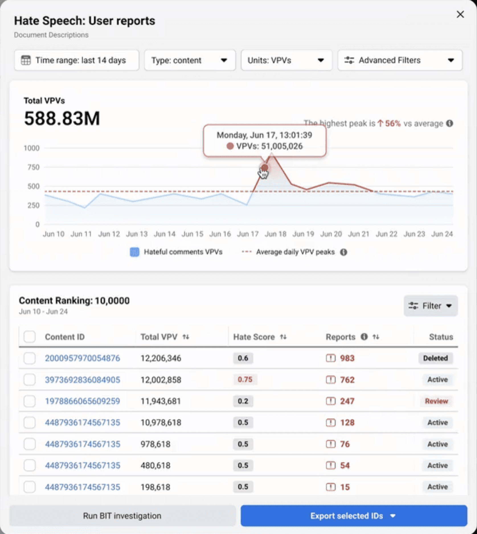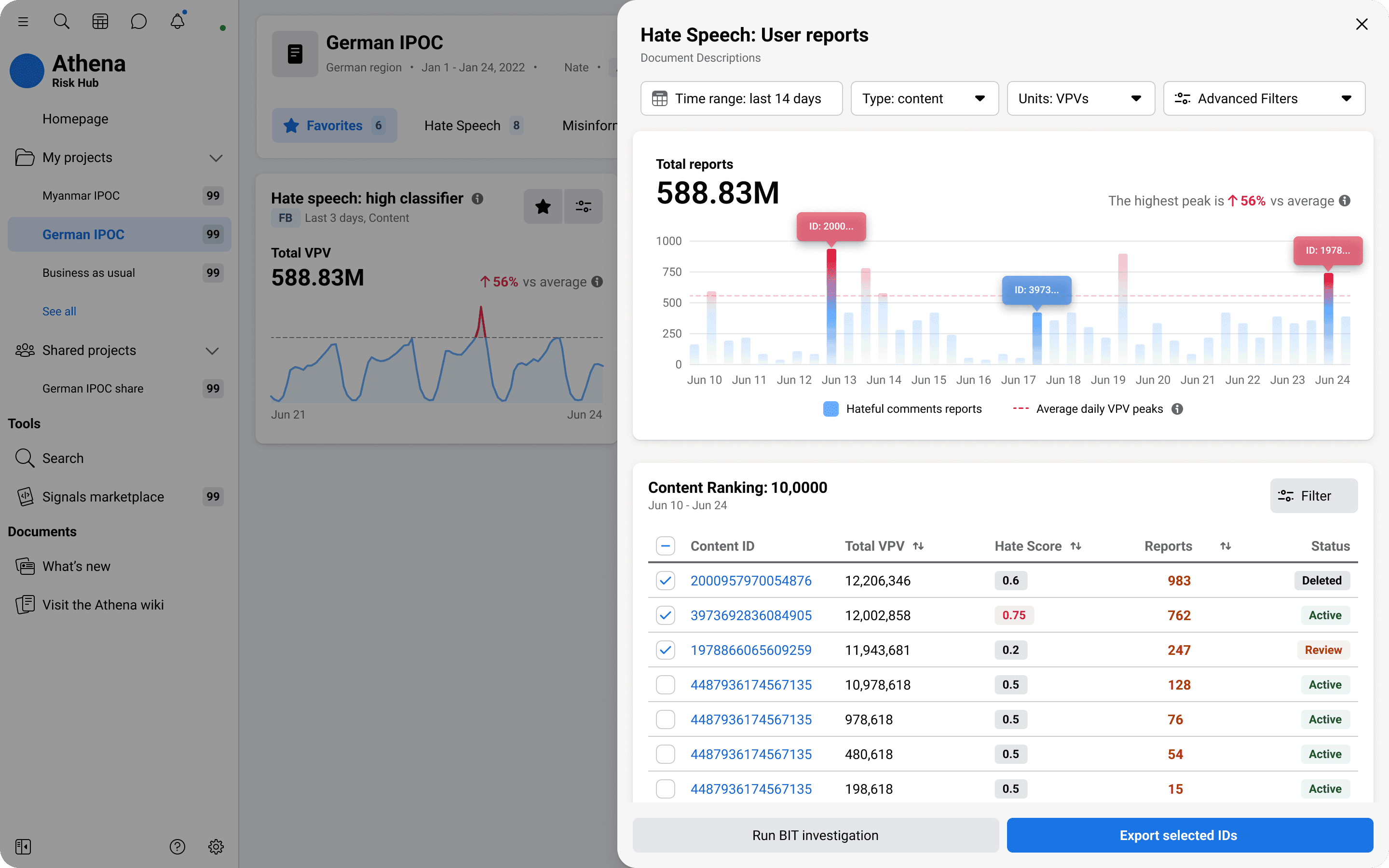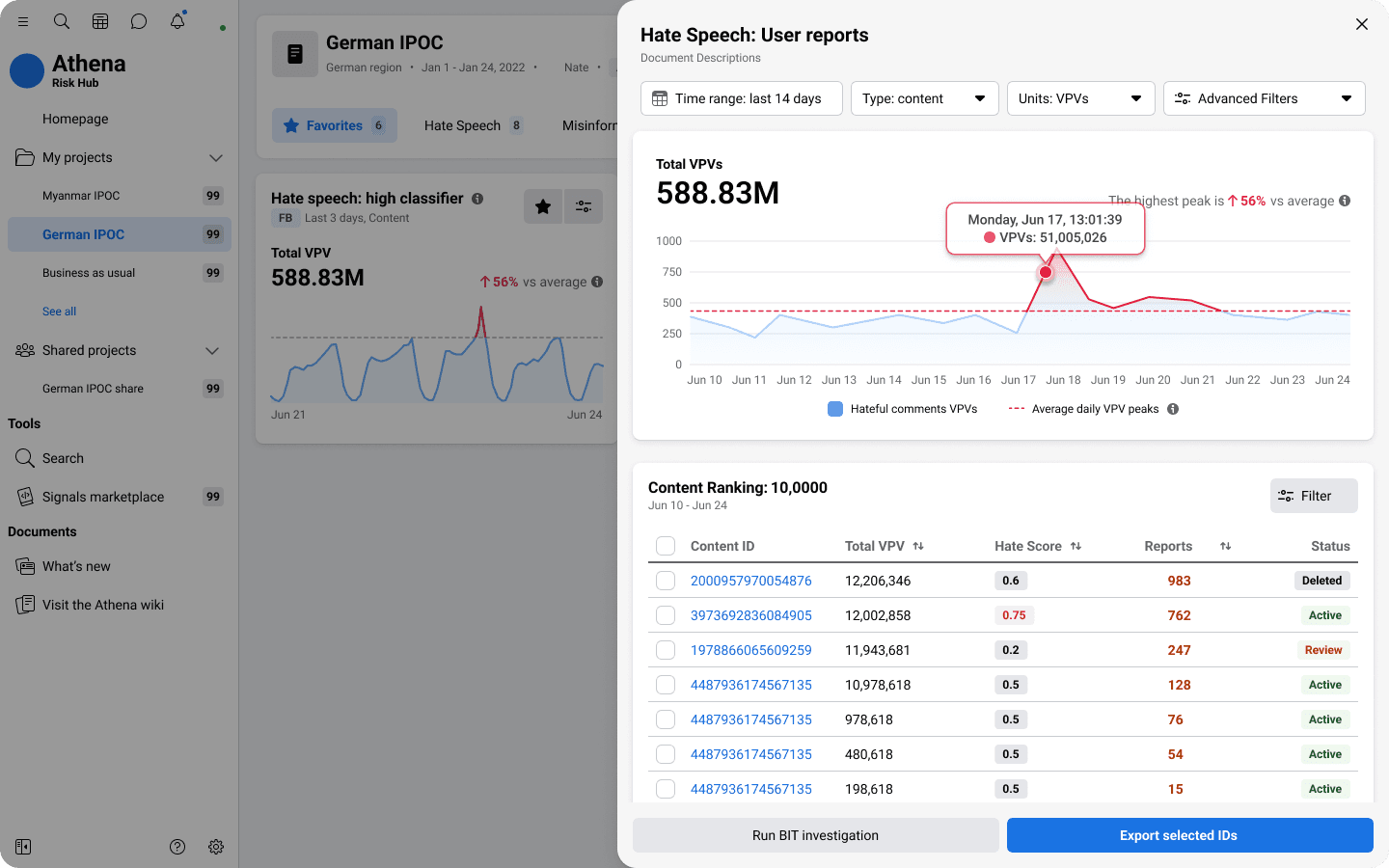 Hate speech items managed globally by the tool